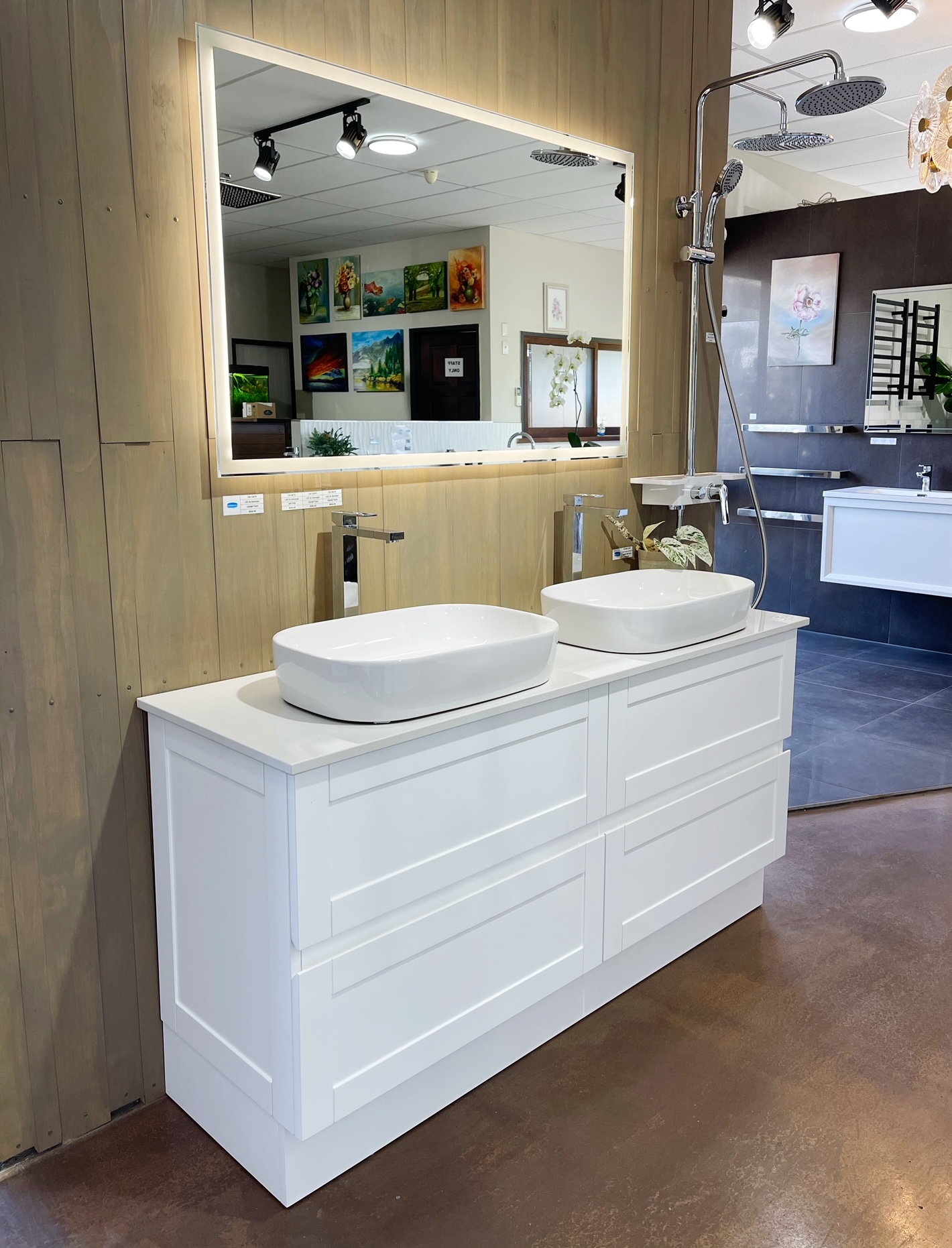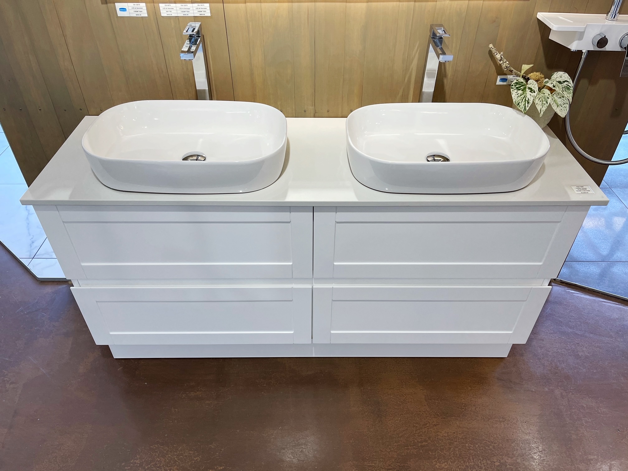 Floor Standing Plywood Vanity 1500 mm with double Sit on Top Basin on Engineering Stone Bench